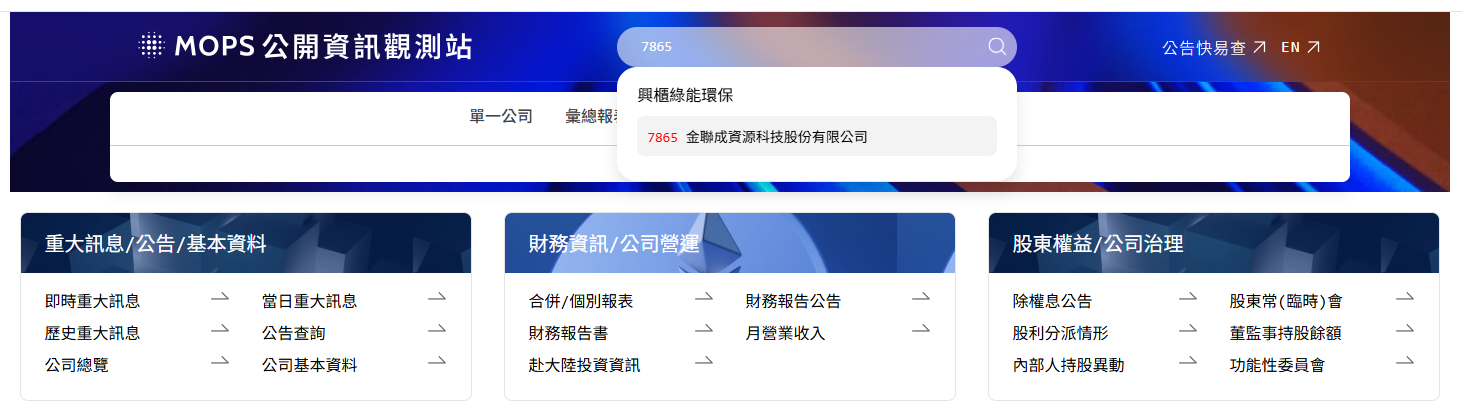 投資人可以透過「公開資訊觀測站」,查詢上市公司、上櫃公司、興櫃公司及公開發行公司之公開資訊。 歡迎各位投資人登入此網站,並利用搜尋功能查詢金聯成的相關訊息。(查詢代號為 7865)