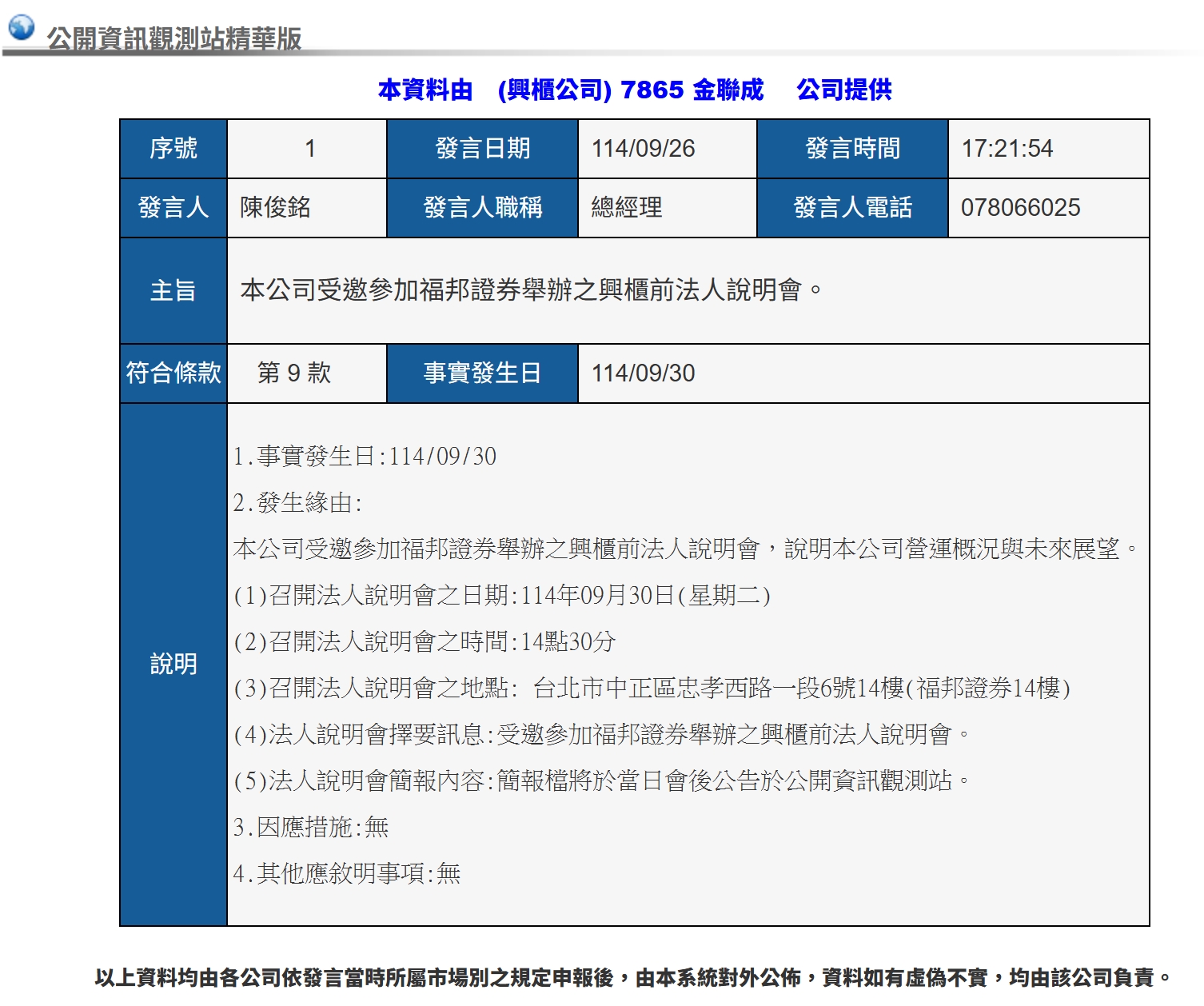 加入9/26重大資訊:召開法說會資訊